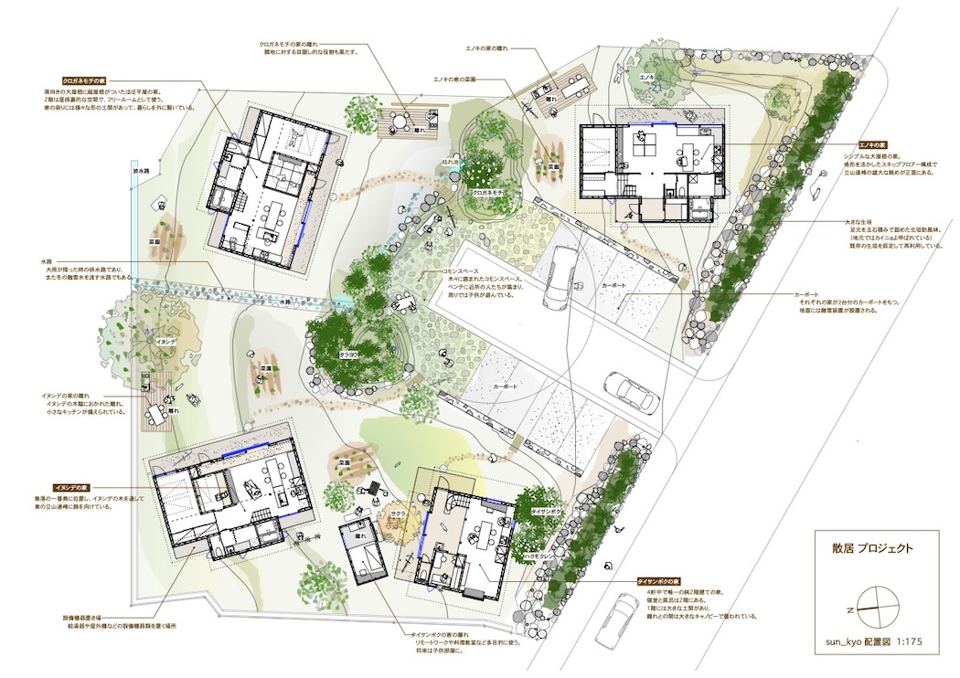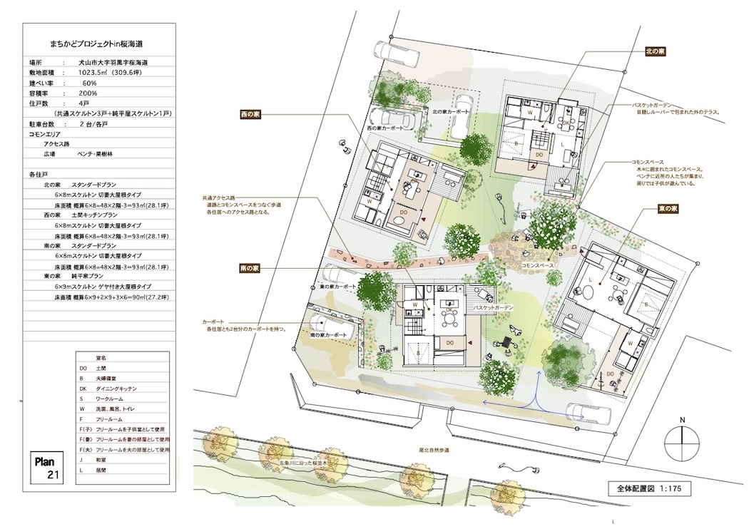 五条川の桜並木に沿う310坪ほどの土地に3軒の平家と1軒の二階建て、合計4軒の群をつくる予定。これができると木曽川を挟むエリアに五つの小さな町が完成します。