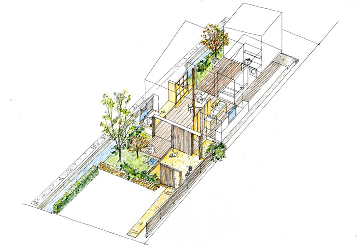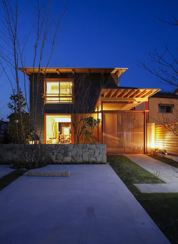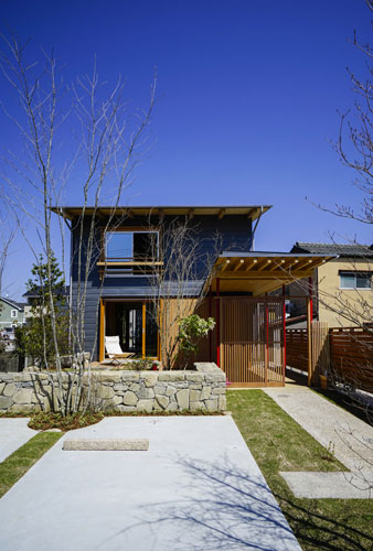 奥行きの深い敷地に建つ現代町家。敷地の両サイドに小川が流れている。奥行きに沿って6メートル角と3×4メートルのベースを置き、間に屋根付きのデッキを挟んで廊下でつなぐ構成。道路から敷地の奥に向かって庭と建物が交互に連続していくため、かつての町家のプランによく似ている。